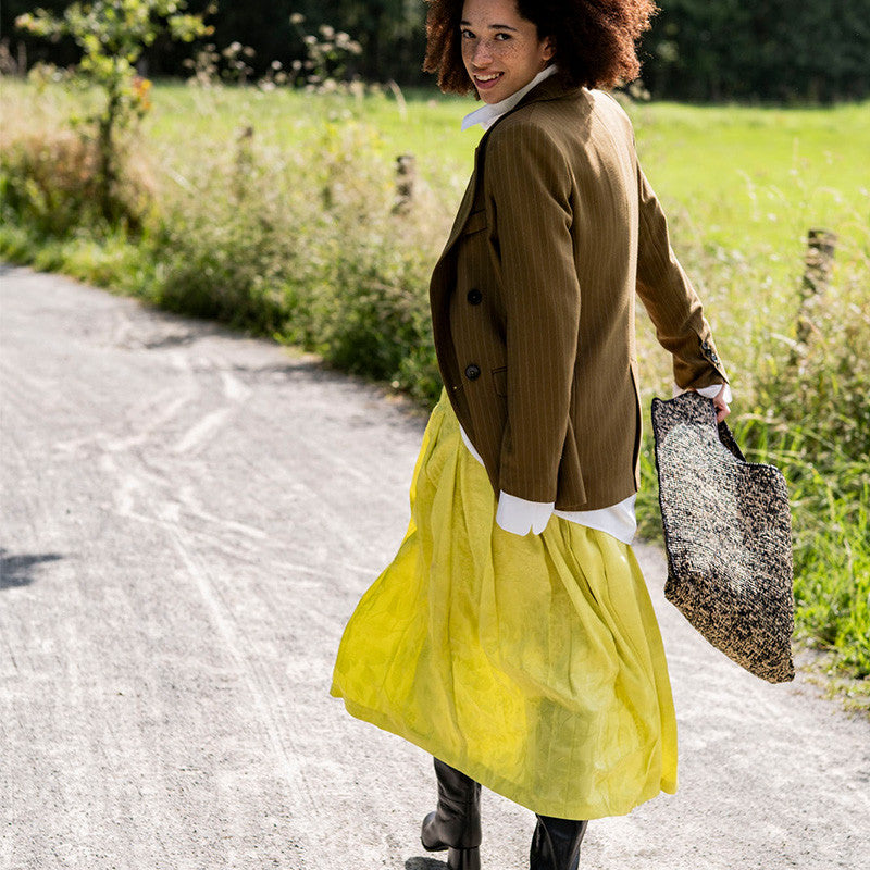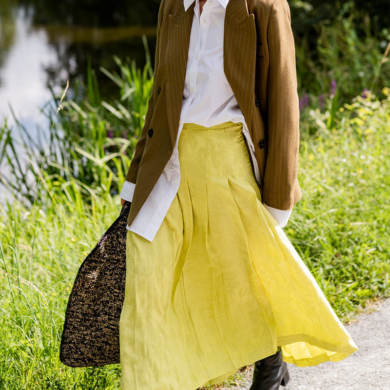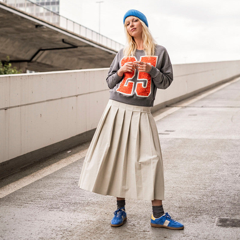 Fausta feiert die Rückkehr des Faltenrocks. Dieser Midirock hat einen Formbund mit Knopfverschluss und einen verdeckten Reißverschluss in der Seitennaht.