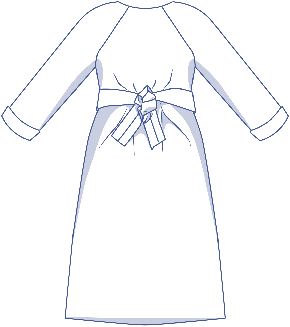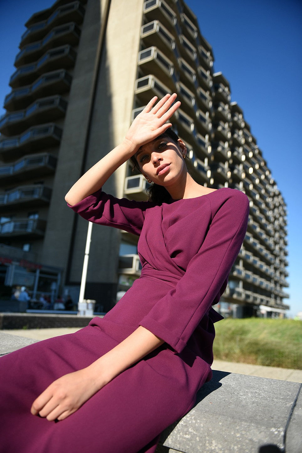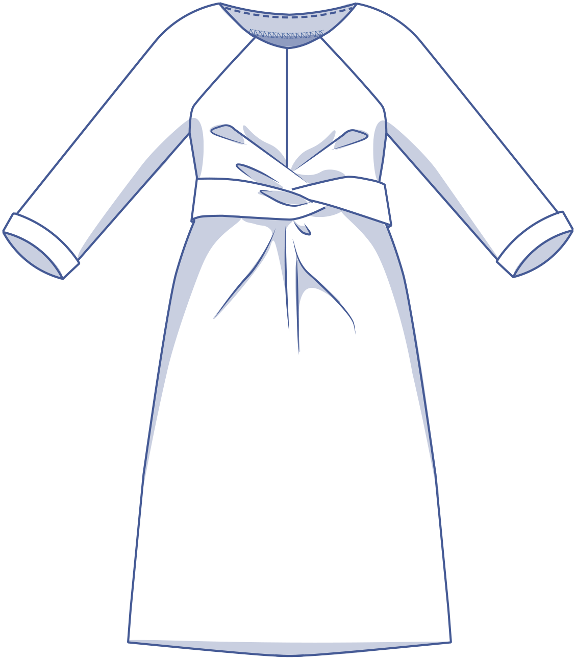 Willa ist ein minimalistisches, gerade geschnittenes Wickelkleid, das bis kurz über das Knie reicht, mit Raglanärmeln und einem hohen runden Halsausschnitt.