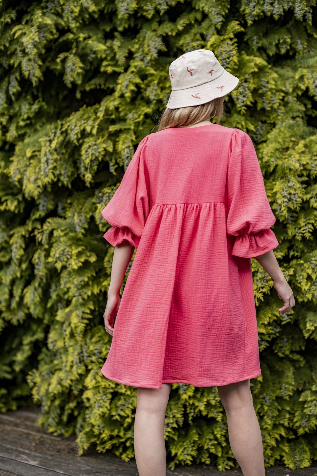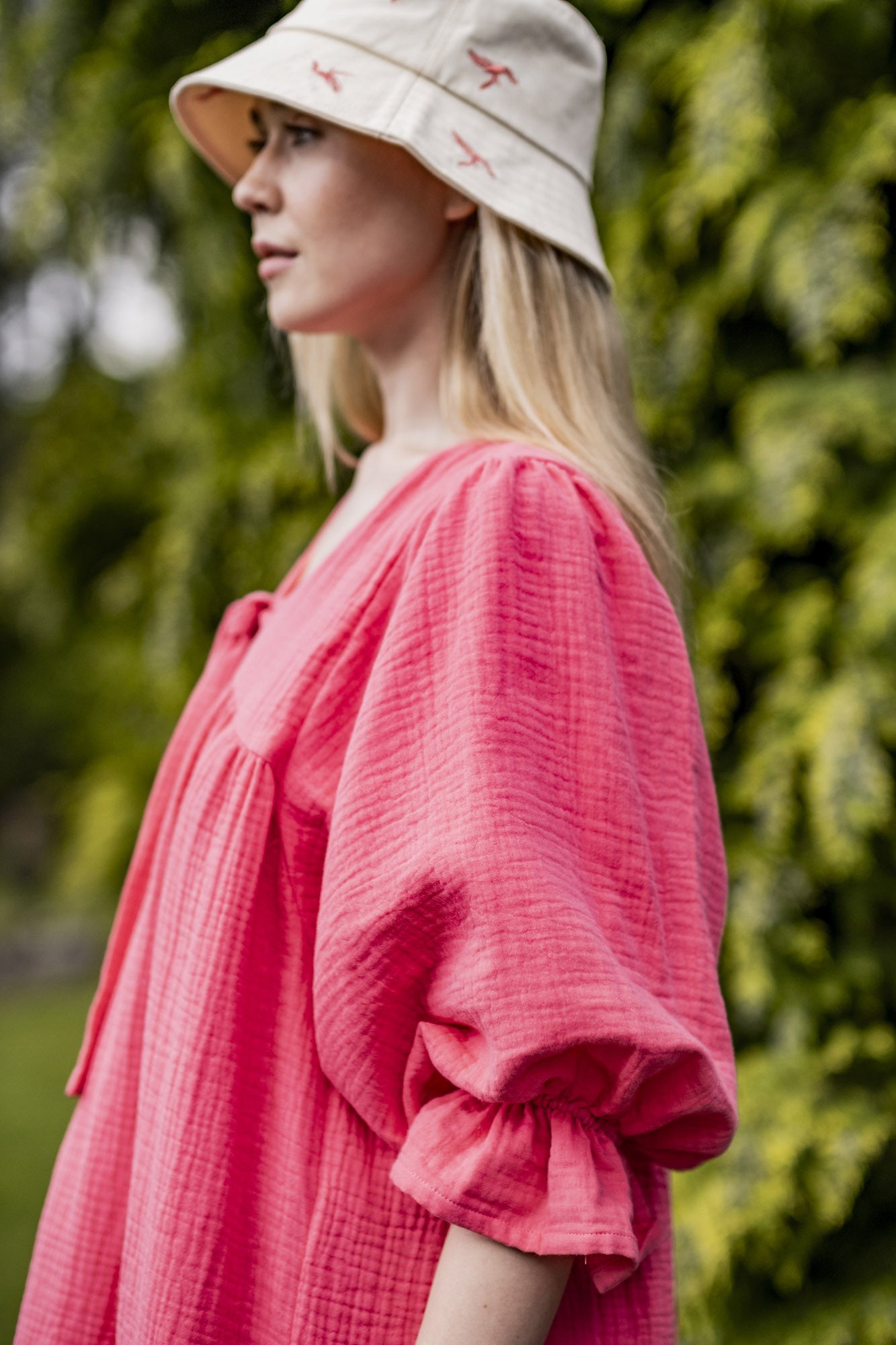 Petit détail sympa : les fronces en haut des manches et le tunnel élastiqué au poignet permettent d’obtenir un bel effet de volant et de retrousser élégamment les manches.
