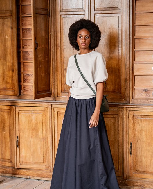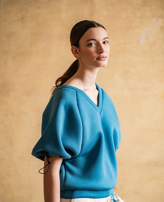 Esha est un sweat-shirt confortable et ample avec de larges manches raglan. Allez-vous opter pour un effet bouffant subtil ou créer des manches spectaculaires qui attirent tous les regards ? À vous de choisir !