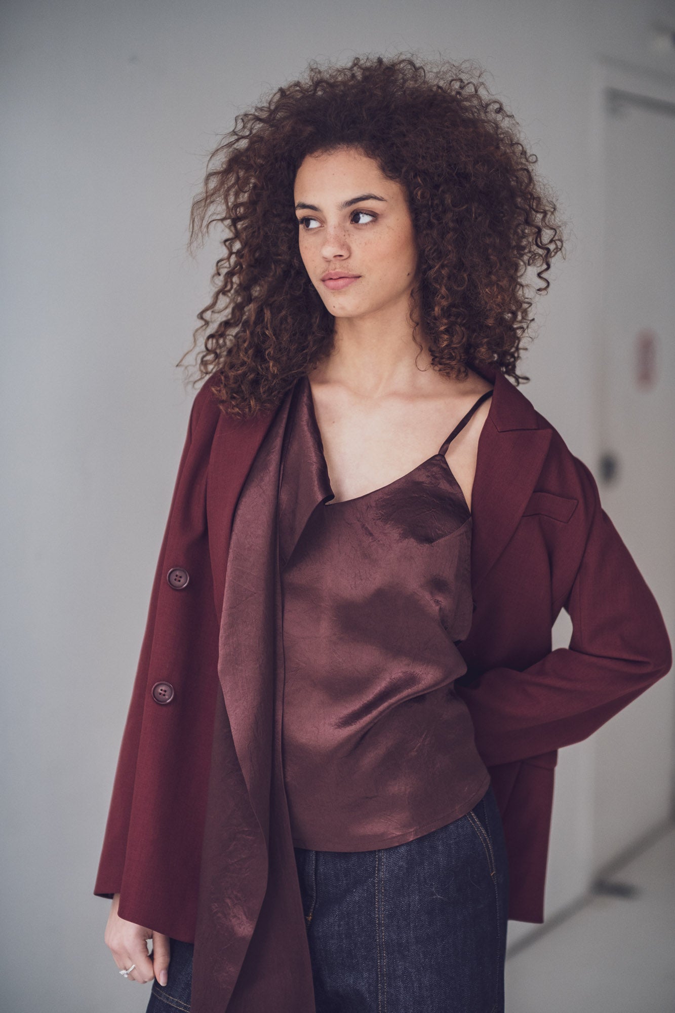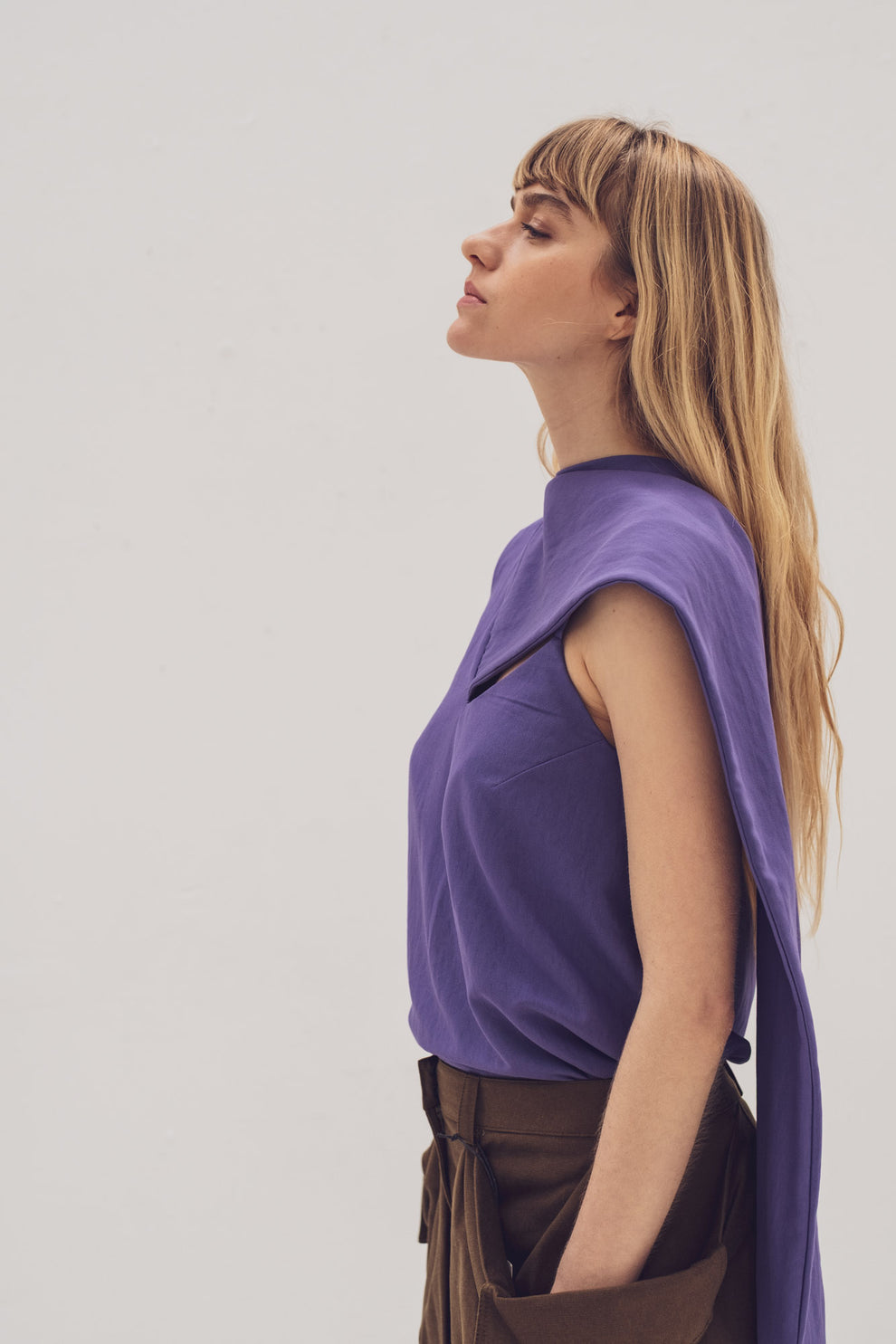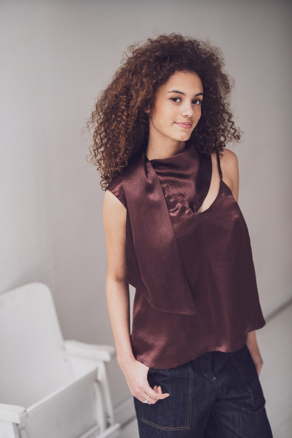 Willow attire tous les regards. La coupe asymétrique, le décolleté dans le dos et le foulard intégré dans l’encolure du panneau devant créent un jeu intéressant de lignes et de contrastes.