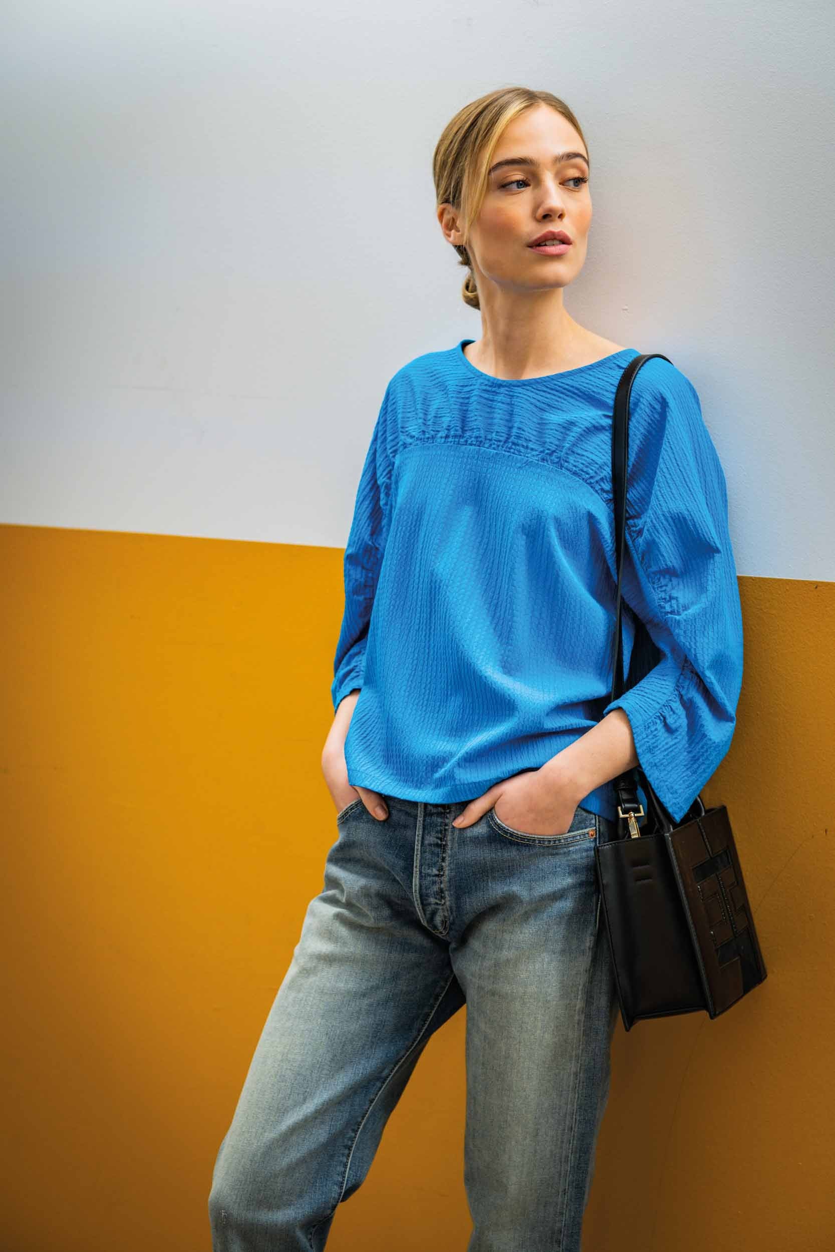 Simpel en toch speciaal. Je moet het maar kunnen. Harper doet het. Deze geniale top heeft driekwartsmouwen, een ronde halslijn en een gerimpeld bovenstuk.