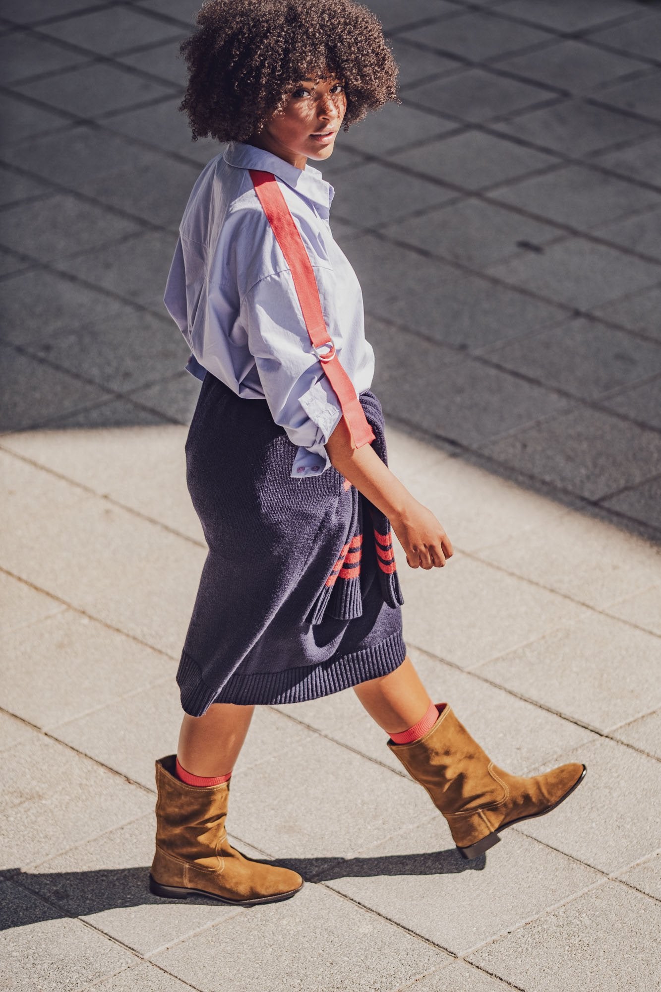 Lena is een eigenzinnige variant op Libbie. Het verschil zit ‘m in de mouw en polsboord: je stropt de mouw op met twee keperlinten en D-ringen.