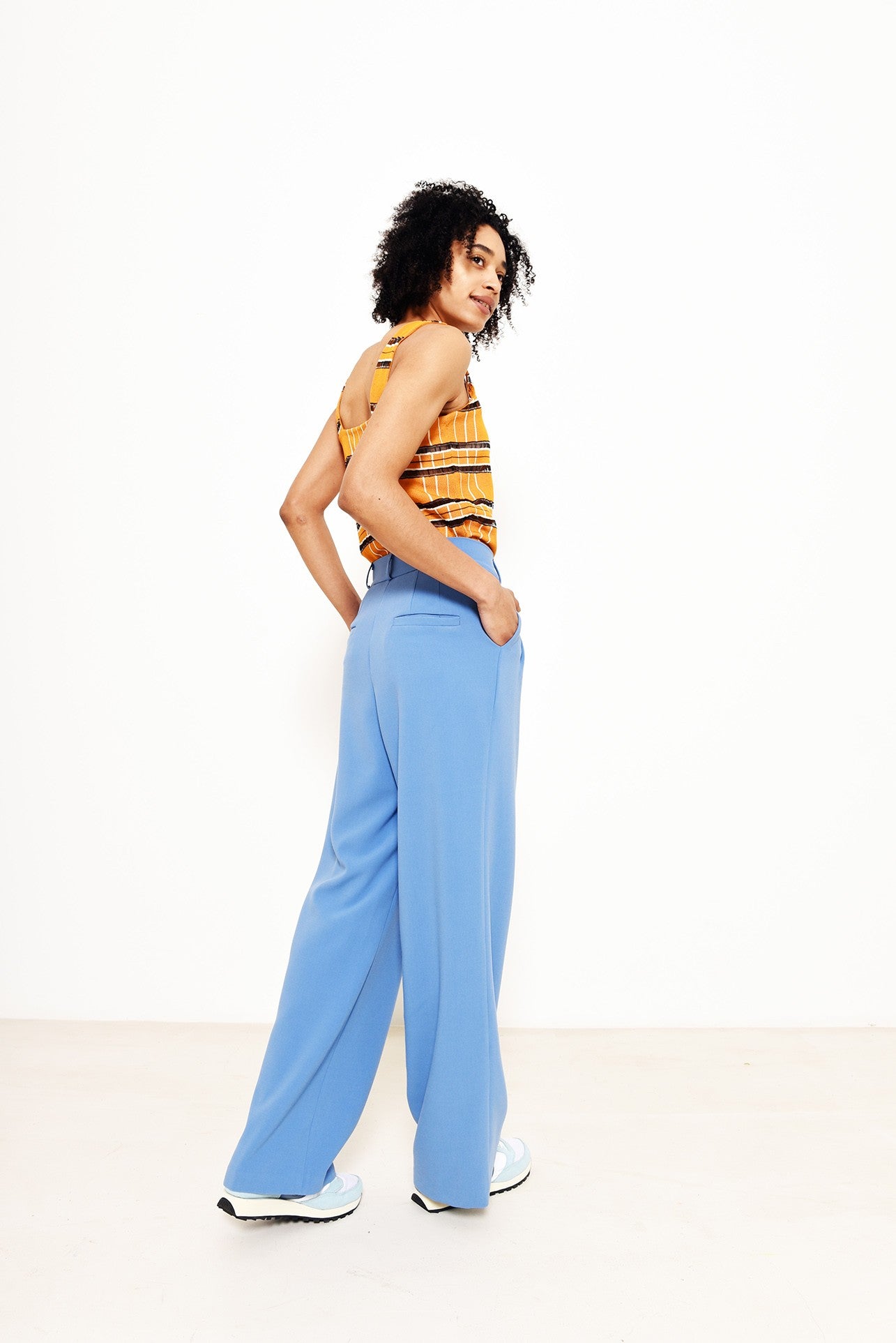 Deze bandplooibroek heeft een hoge taille, wijde pijpen en handige steekzakken.