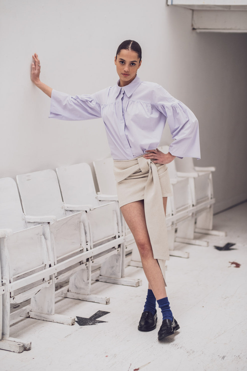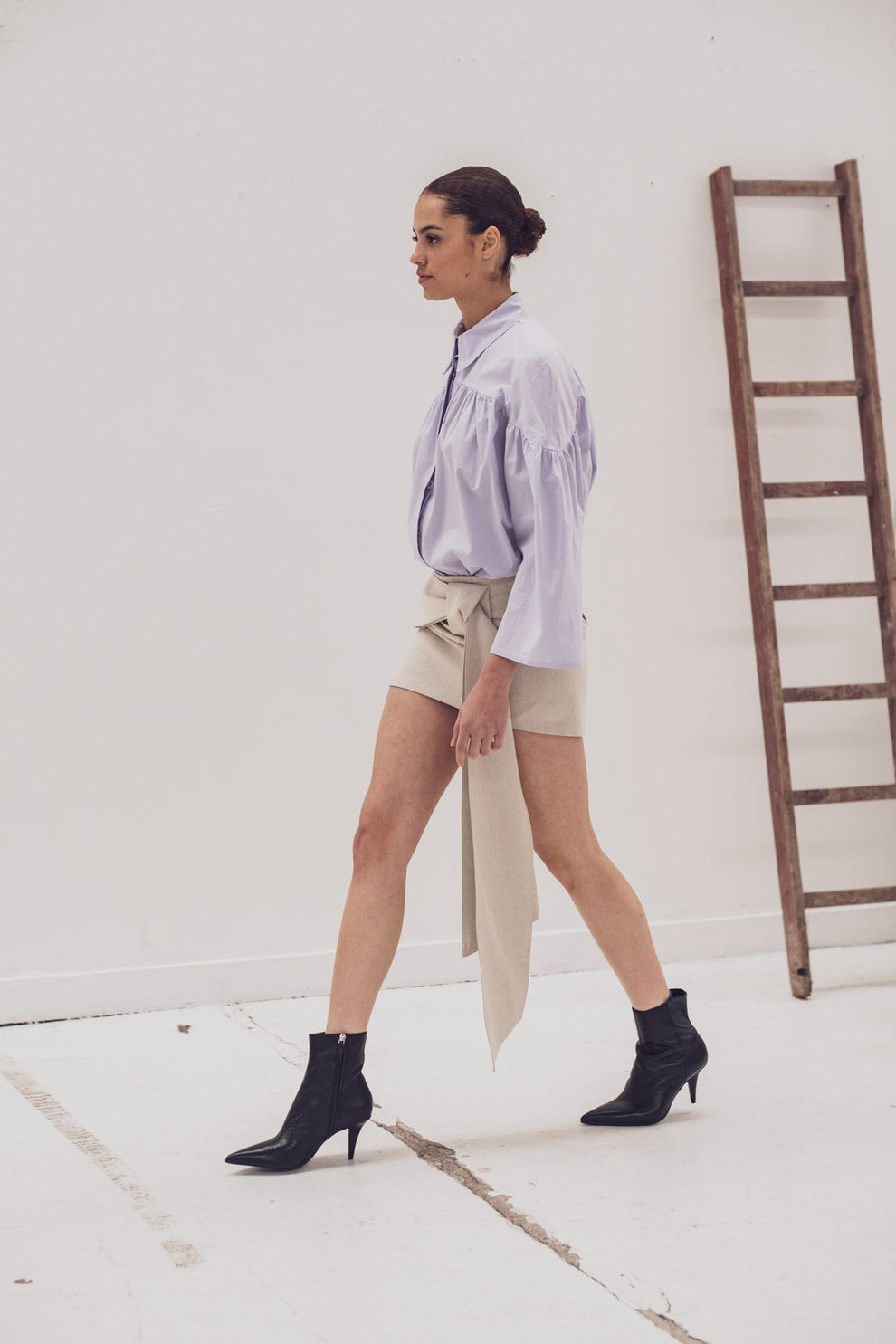 Caren plays it smart: soft and romantic, but with a sleek counterpart. Romantic, thanks to the gathers all around.