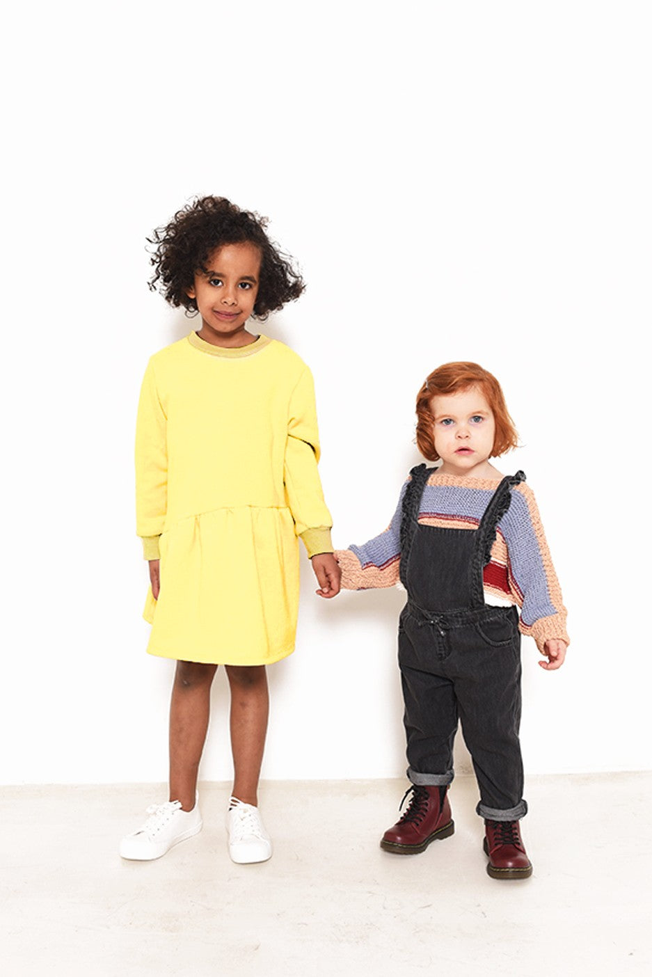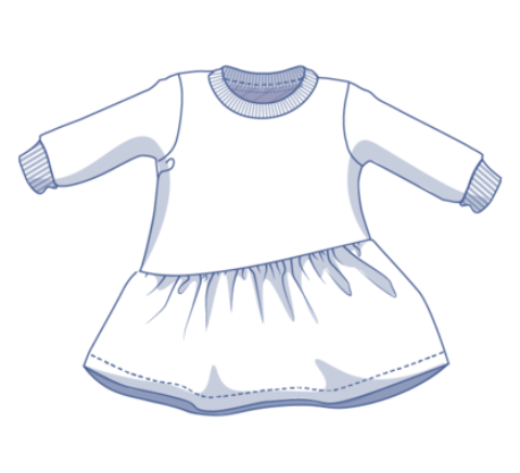A roomy, ruffle-waist sweater dress for big sisters and little baby sisters alike. We made sure to add a button closure on the shoulder of the infant version.