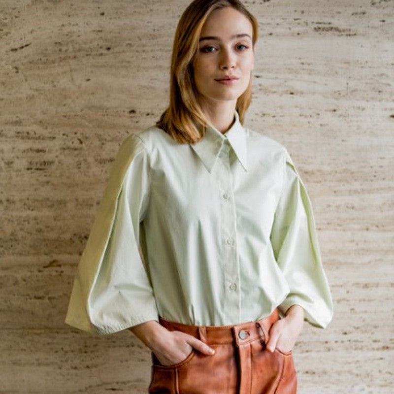 This short, loose Odyna button-down blouse gets extra boost with an A-line pleated sleeve. Prefer something more classic? That's possible with a different sleeve.